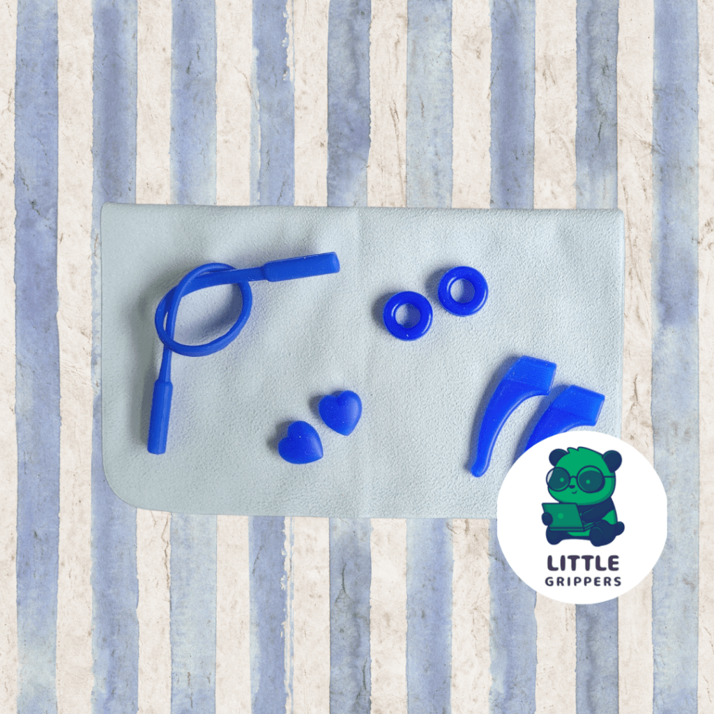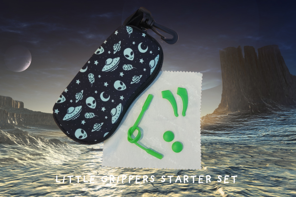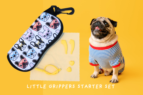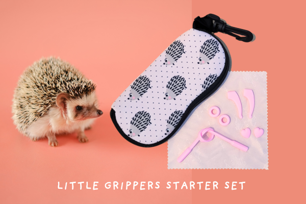 The Little Grippers Starter Set has everything your child needs to start wearing glasses with comfort and confidence. It includes a cleaning cloth, case with bag clip, traditional ear grippers to prevent slipping, shape grippers for a discreet hold, and a strap to keep glasses secure during play. All accessories are made from soft, easy-to-clean silicone. Prefer a different colour or strap option? Just let us know—we’re happy to help.